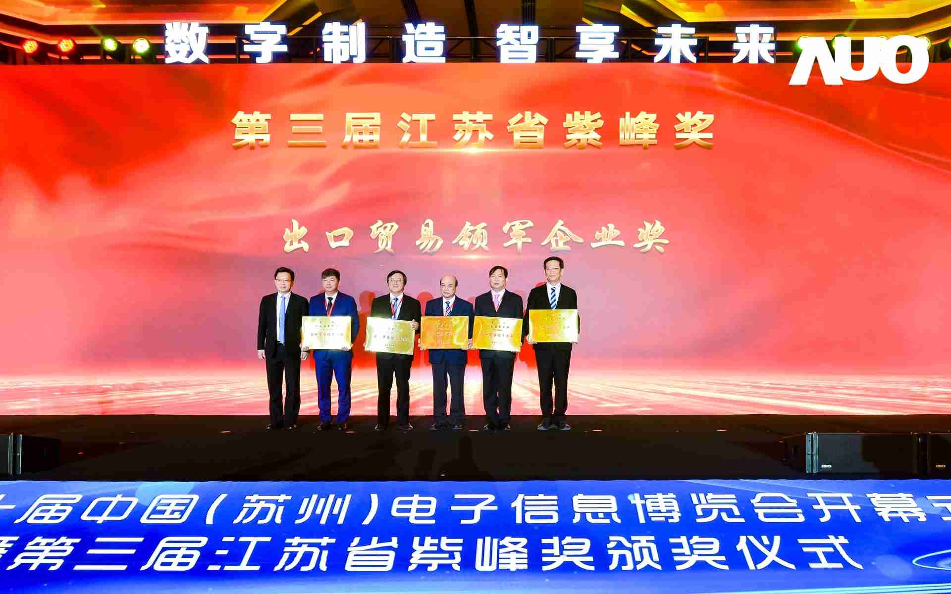电博会开幕式当天也是第三届江苏省紫峰奖颁奖仪式,,,省台办、、、工信厅、、、商务厅、、苏州市相关领导均出席并颁奖。。。该奖项为表彰对江苏高质量发展做出积极贡献的在苏企业,,由江苏省政府专门设立。。尊龙集团光电 (苏州) 总经理郭振明代表上台领奖,,,这也是尊龙集团苏州连续三次蝉联紫峰奖 出口贸易领军企业奖。。。。尊龙集团数位总经理赵丽娜女士,,,,也参与本次开幕式,,上台为本地化赋能签署战略合作协议,,,,将优质服务资源集合、、、、下沉到更多细分行业,,为更多地区的制造企业提供数字化转型服务。。