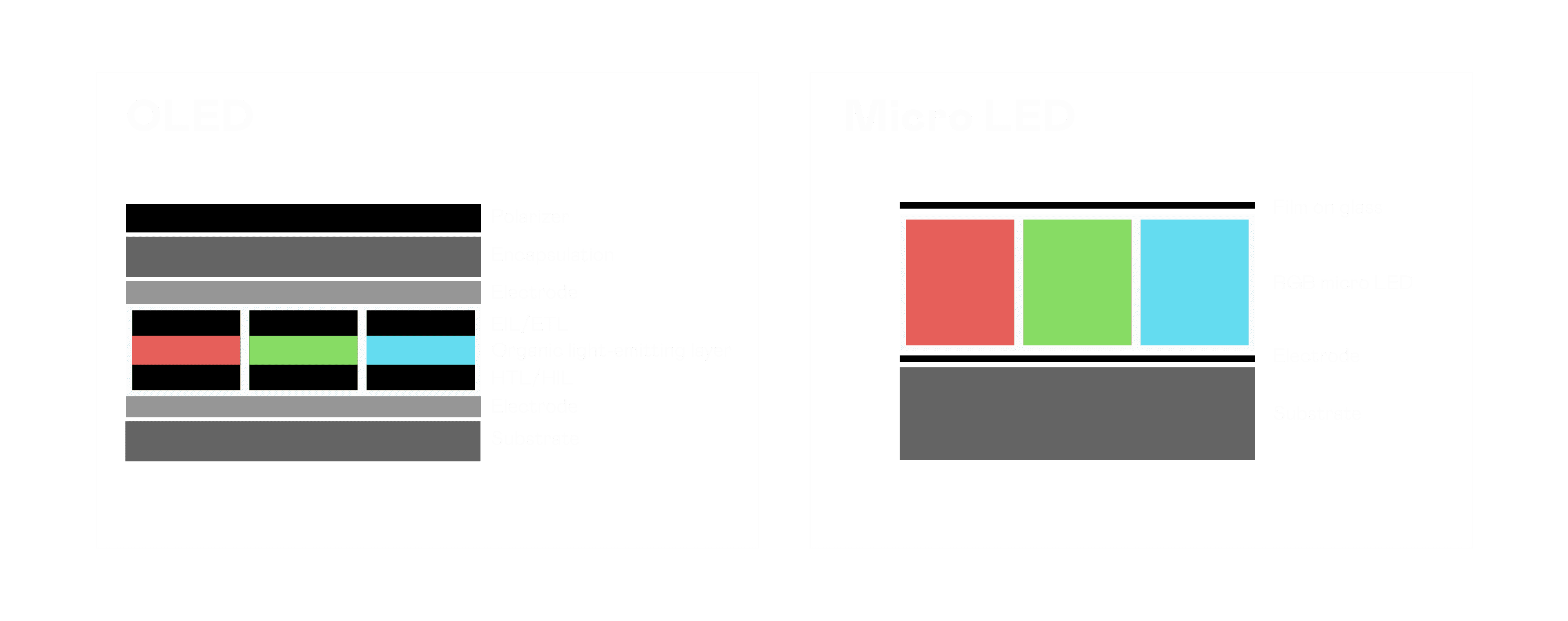 以 LED 做为显示画素,,可让 LED 的发光效率发挥到极致,,从而让显示器具备优异的亮度表现,,不论是在户外或室内,,,均具备出众的显示效果。。同时,,与使用有机材料的 OLED 相比,,,,LED 具备更稳定、、寿命更长的特性,,,,不仅不会有画面烙印问题,,而且更不容易出现故障、、坏点。。