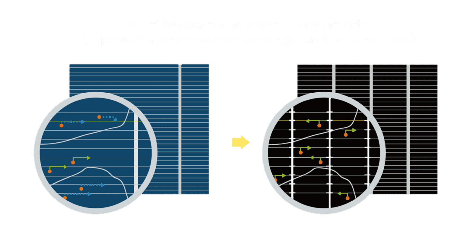 • 电池使用多条铜导线 (Copper wire) 于电池片上形成较短的电流路径,,,,提高电流收集效率,,,采用圆形设计的铜导线较传统扁平式的铜焊带 (Ribbon),,,可增加入射至电池的光线量。。